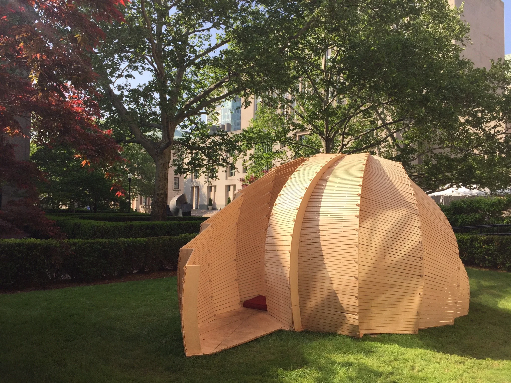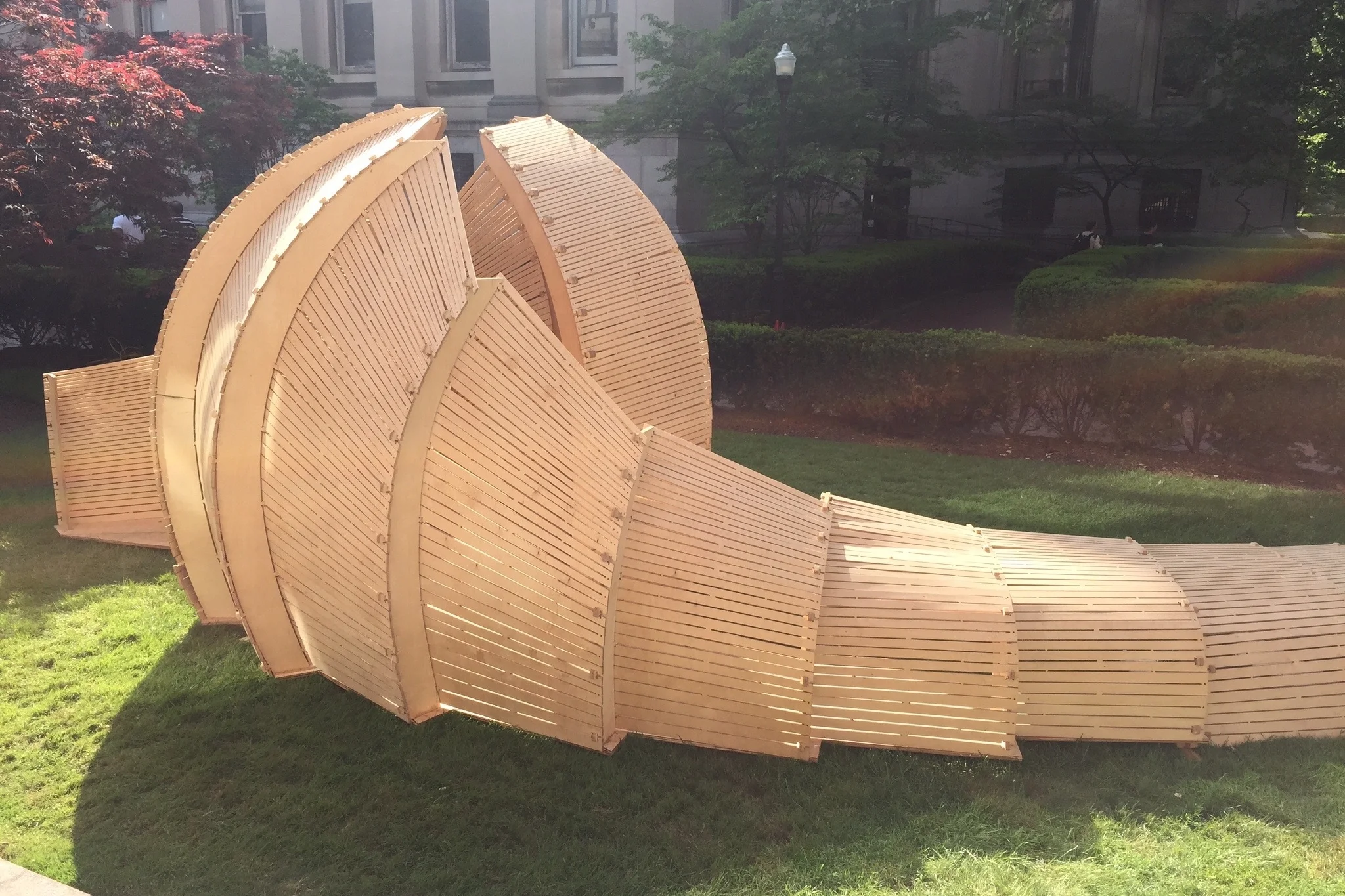 Kerby is a little monster of a pavilion. He is made of panels full of kerfs, or sninges, that allow stiff material to become flexible and curved. He was born to be a world traveler. Kerby can easily flat-pack and fit in a crate to visit cities all over the world. He is low maintenance and can be re-built quickly, like a big 3D puzzle.