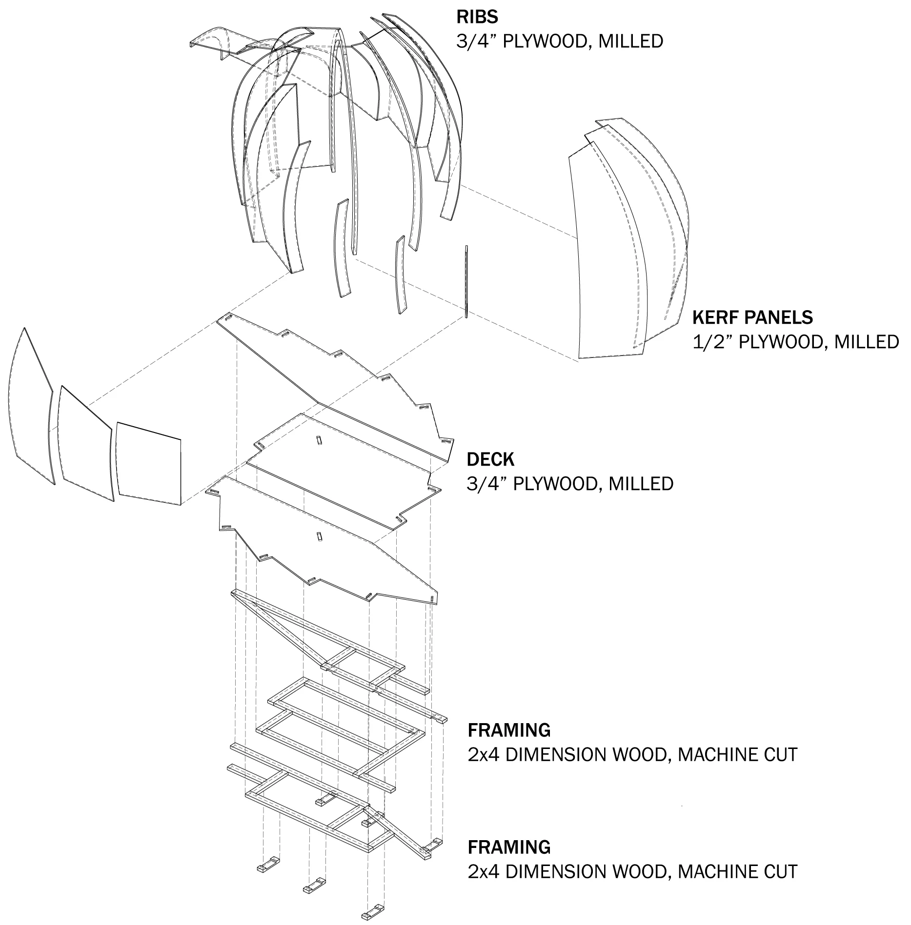 Scripting computer software allowed for a system of predictable Kerfs that would manipulate the panels to produce the correct bends to render the desirable form.