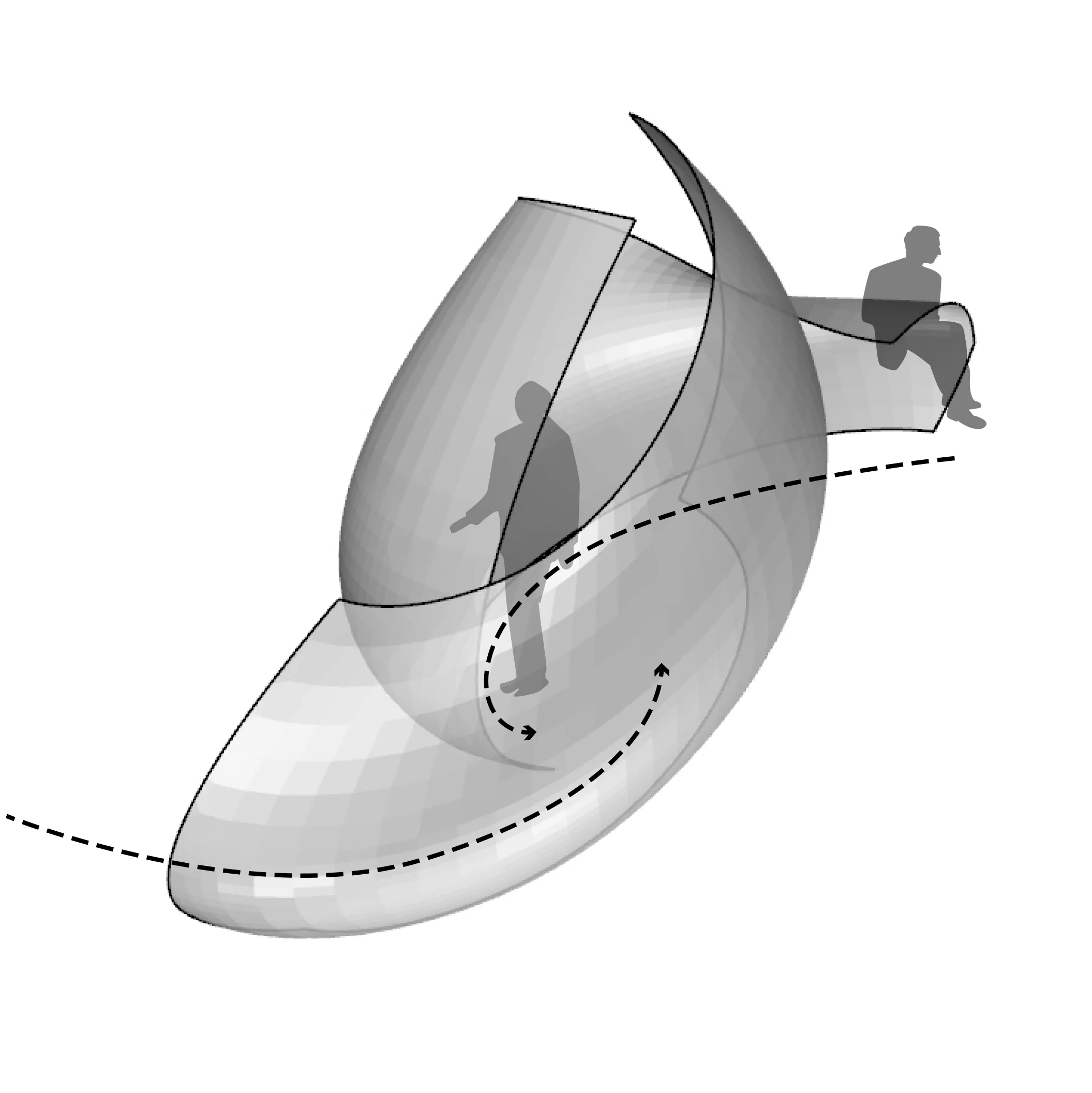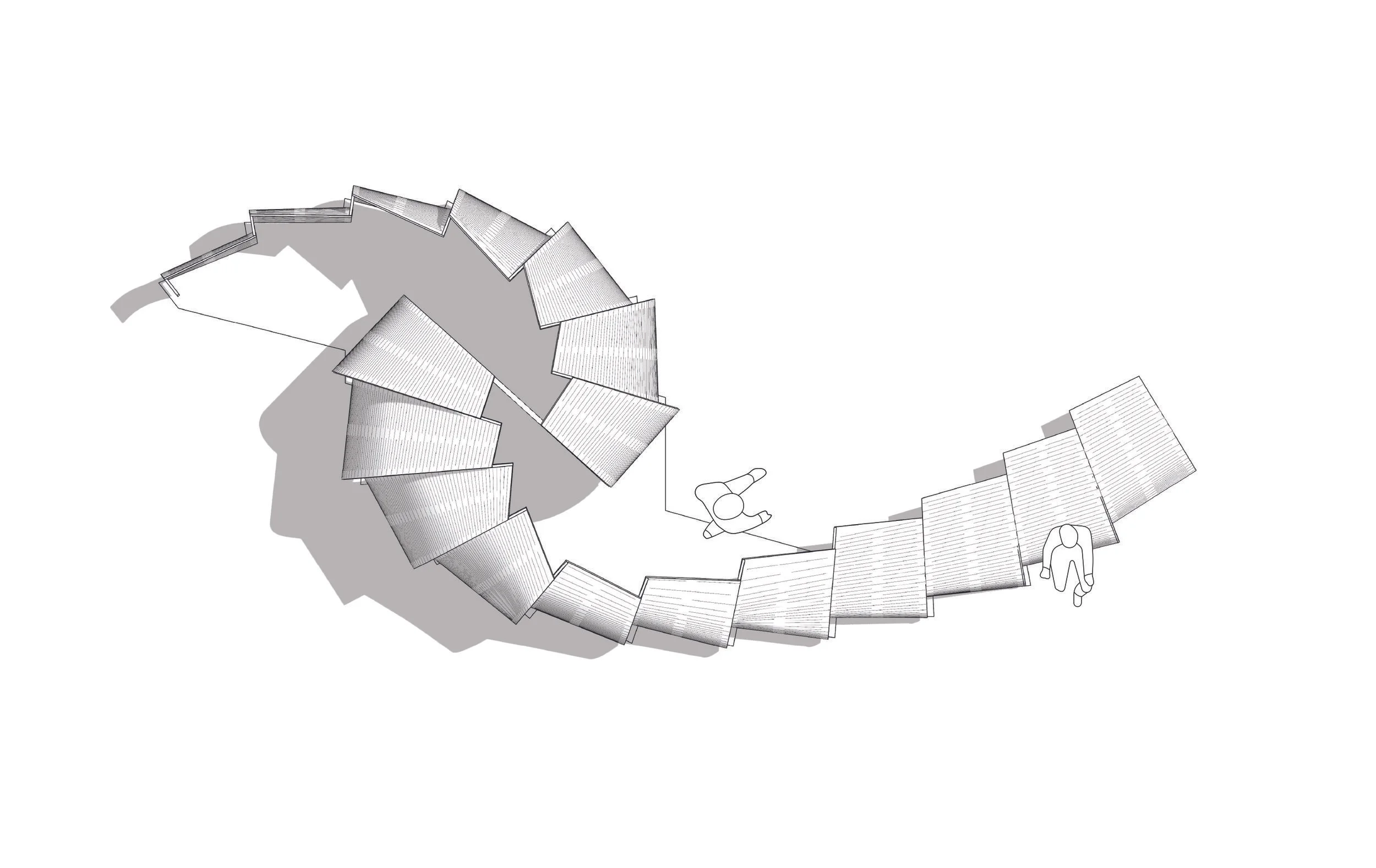 Through a series of study models the design became a series of repeatable movable parts. Ultimately, Kerby would be two interlocking shellscomprised of these parts. Their embrace generates a path